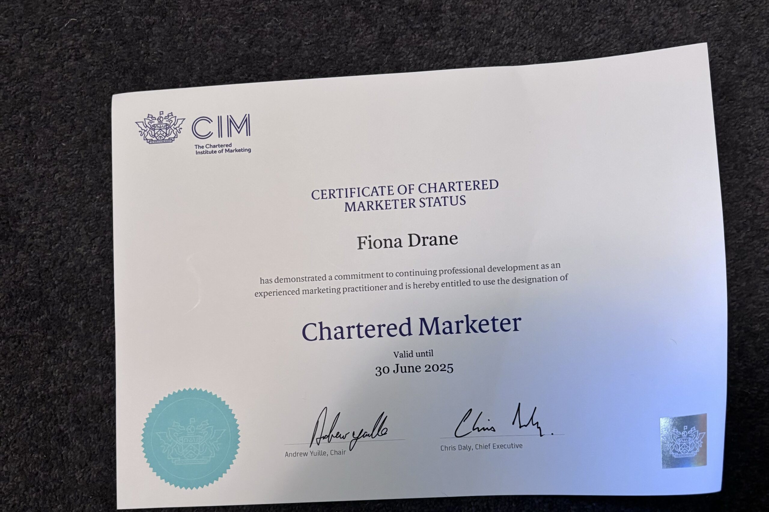 As a Fellow of the Chartered Institute of Marketing, I am committed to continuous professional development. To retain this status, I complete my professional development and submit it to the Chartered Institute of Marketing every July. I ensure I stay updated with the ever-changing marketing world through online learning, such as a Strategic Digital Marketing Course with Robert Gordon University and the Digital Marketing Institute.